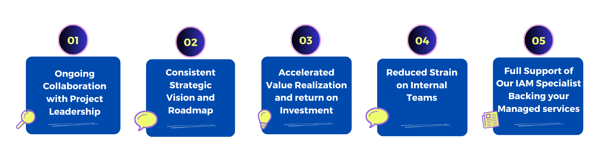 By choosing our IAM Managed Services, you ensure that the depth of knowledge gained during implementation continues to benefit your organization throughout its operational journey. We bridge the gap between project completion and ongoing management, providing a seamless experience that maximizes the value of your IAM investment.